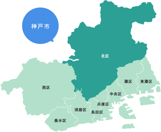 〒651-1195 神戸市北区鈴蘭台北町1丁目9番1号 北区役所内6階 TEL:078-593-1111(代)/FAX:078-593-9822