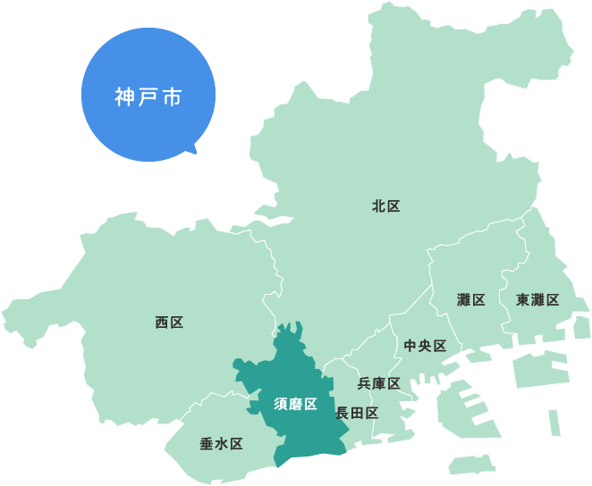 〒654-8570 神戸市須磨区大黒町4丁目1番1号須磨区役所内3階 TEL:078-731-4341(代) FAX:078-733-2533