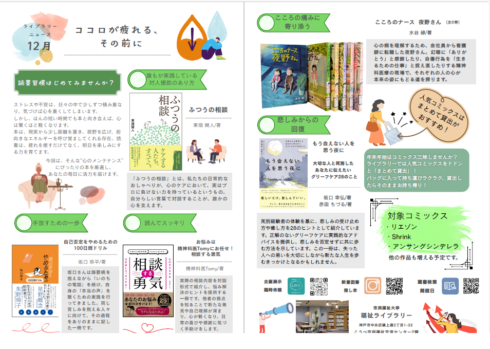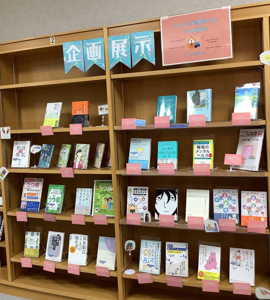 福祉ライブラリーにて、12月1日~27日の期間、 「ココロが疲れる、その前に」と題した企画展示を行っています。 ストレスや不安は、日々の中で少しずつ積み重なり、気づけば心を重くしてしまいます。 今回は、そんな“心のメンテナンス”にぴったりの本を厳選し、あなたの毎日に活力を届けます。 ラインナップ一部ご紹介 <図書> |