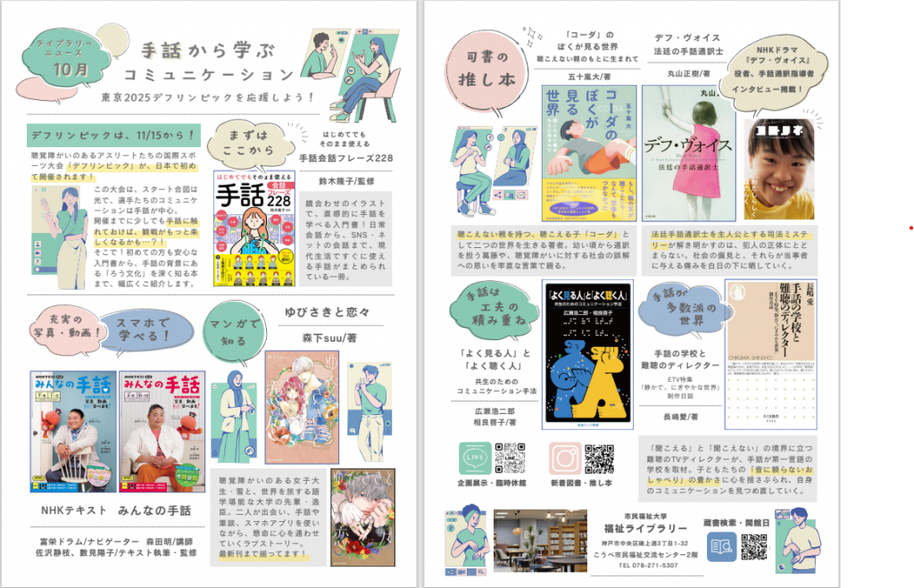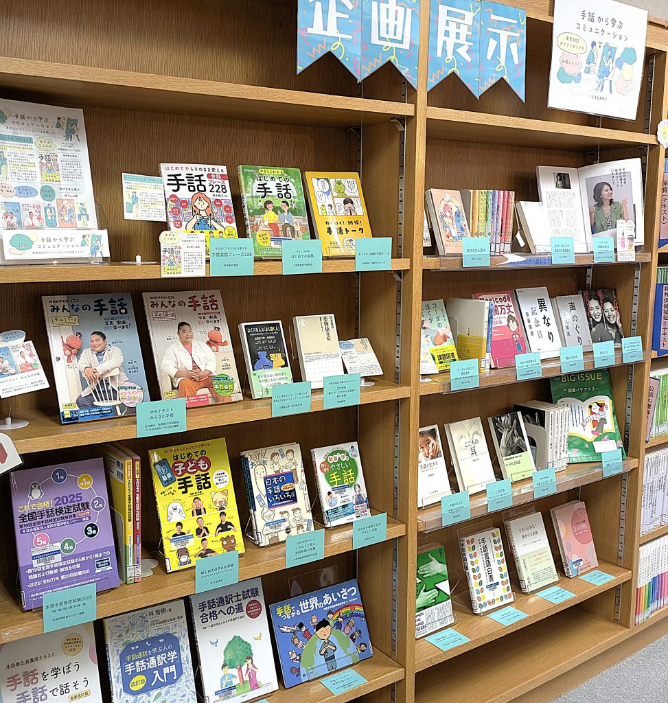 福祉ライブラリーにて、10月1日~31日の期間、 「手話から学ぶコミュニケーション~東京2025デフリンピックを応援しよう!~」 と題した企画展示を行っています。