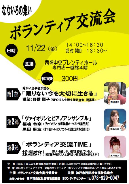 西区ボランティアセンターに既に登録している、ボランティア活動に興味がある、これからボランティアを始めたい、といった方にお知らせです! 西神中央プレンティホールにて『ボランティア交流会』を実施します!定員は100名で先着順、詳細は下記チラシをご覧ください♪