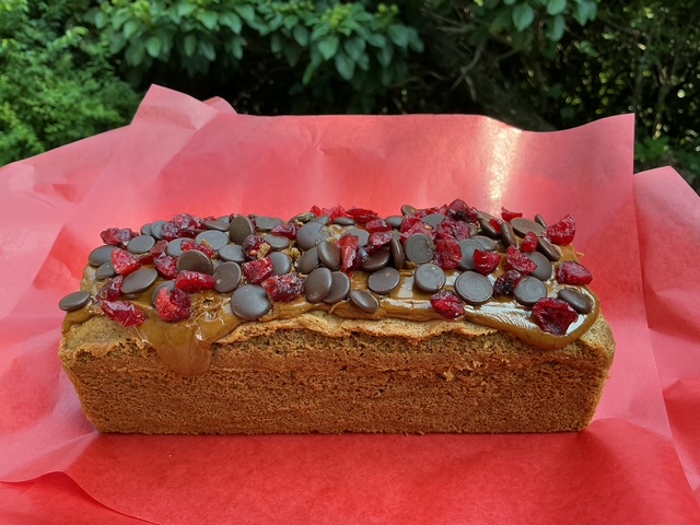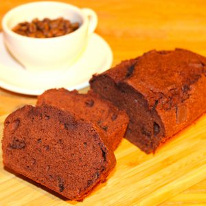 コーヒー味のパウンドケーキに、チョコとキラキラ輝く真っ赤なクランベリーをトッピング