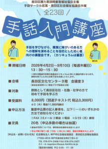 日 時:2026年4月2日~9月10日(毎週木曜日)13:30~15:30 全23回 会 場:長田区文化センター3階 会議室3 (神戸市長田区若松町5-5-1東急プラザ新長田3階) 参加費:8,000円(別途テキスト代 税込3,300円) 定 員:20名(申込多数の場合は抽選) 申込み:下記チラシにご覧の上、長田ボランティアセンターまでお申し込みください。
