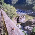 武庫川の流れを右手に見ながら、列車が走っていた道を歩きます。この廃線跡は枕木の上を歩いたり、渓谷の美しさを堪能するのはもちろんですが、最大の見どころはトンネルです。静寂の中、漆黒の闇を懐中電灯の明かりを頼りに進みます。数百メートルはとても長く感じます。夏はとても涼しく人気があるそうです。肝が冷えるのもあるかもしれませんが。