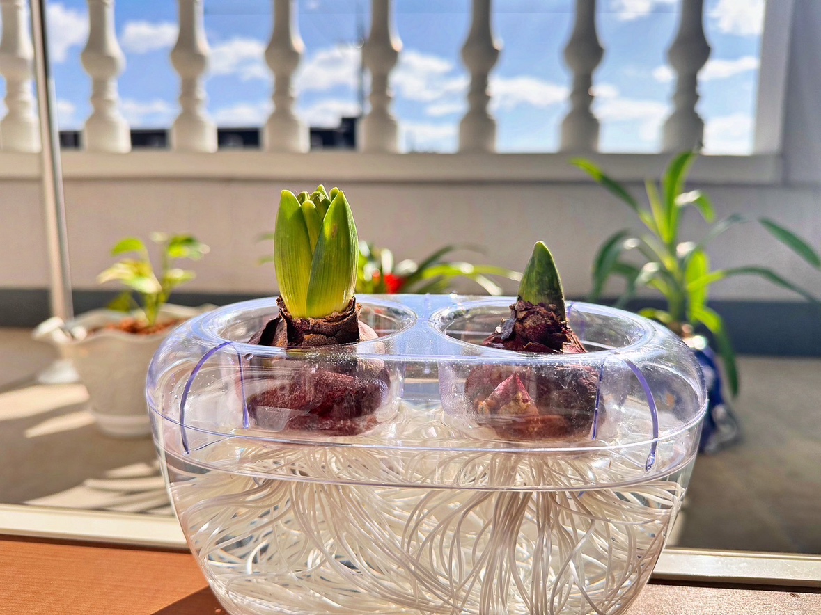 毎朝、「今日はどのくらい葉が伸びたかな」とヒヤシンスを眺める時間が、冬の楽しみとなり、寒さが苦手な私にとって心温まるひとときでした。