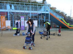 体に重りを付けて歩いてもらいました。「歩かれへーん」とか、重りを外した後「体が軽い!」
