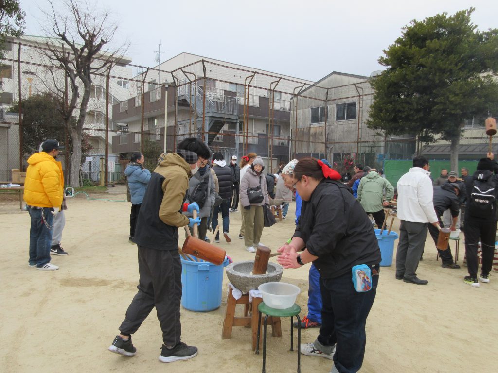 去る2月8日日曜日に南尻池公園で「寒もちつき」が開催されました。当日は、例年にないぐらいの雪が降り、また、衆議院議員選挙も重なりましたが多くの方が参加されていました。