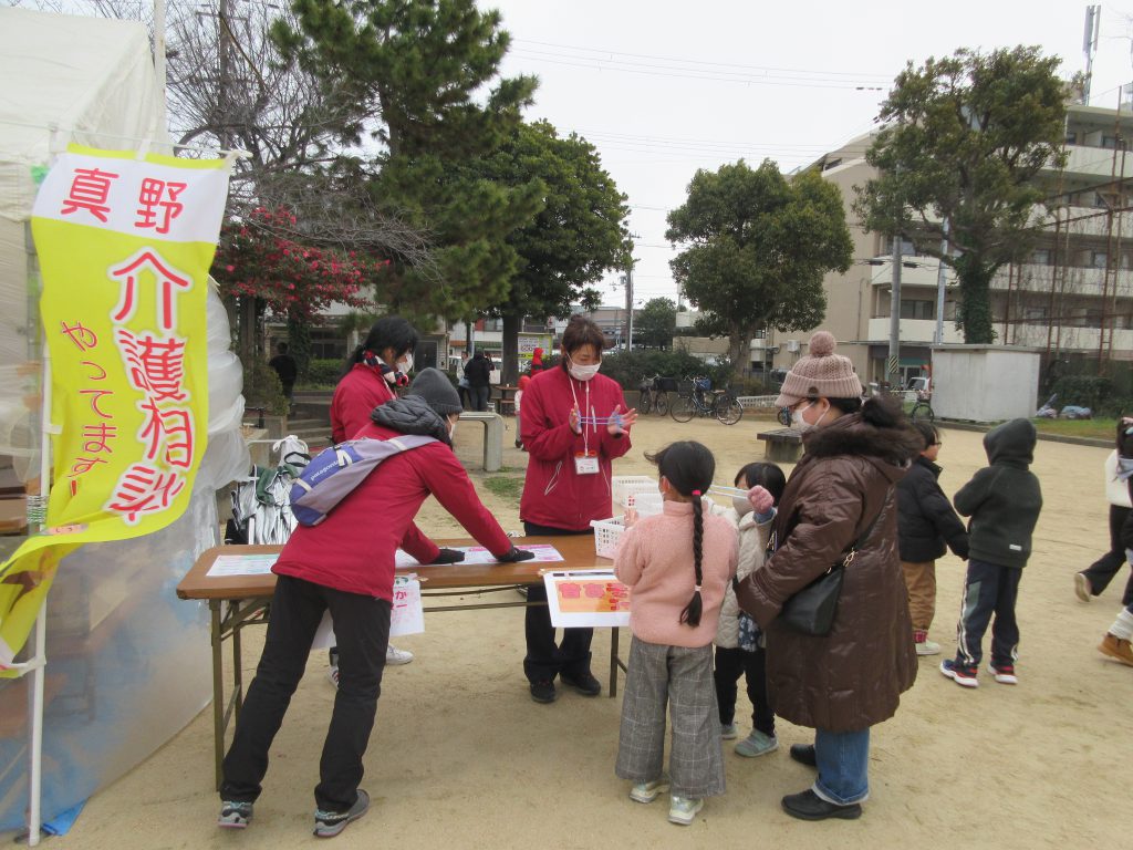 真野真陽あんしんすこやかセンターは、介護相談と昔あそび(けん玉・おじゃみ・あやとり)を行いました。