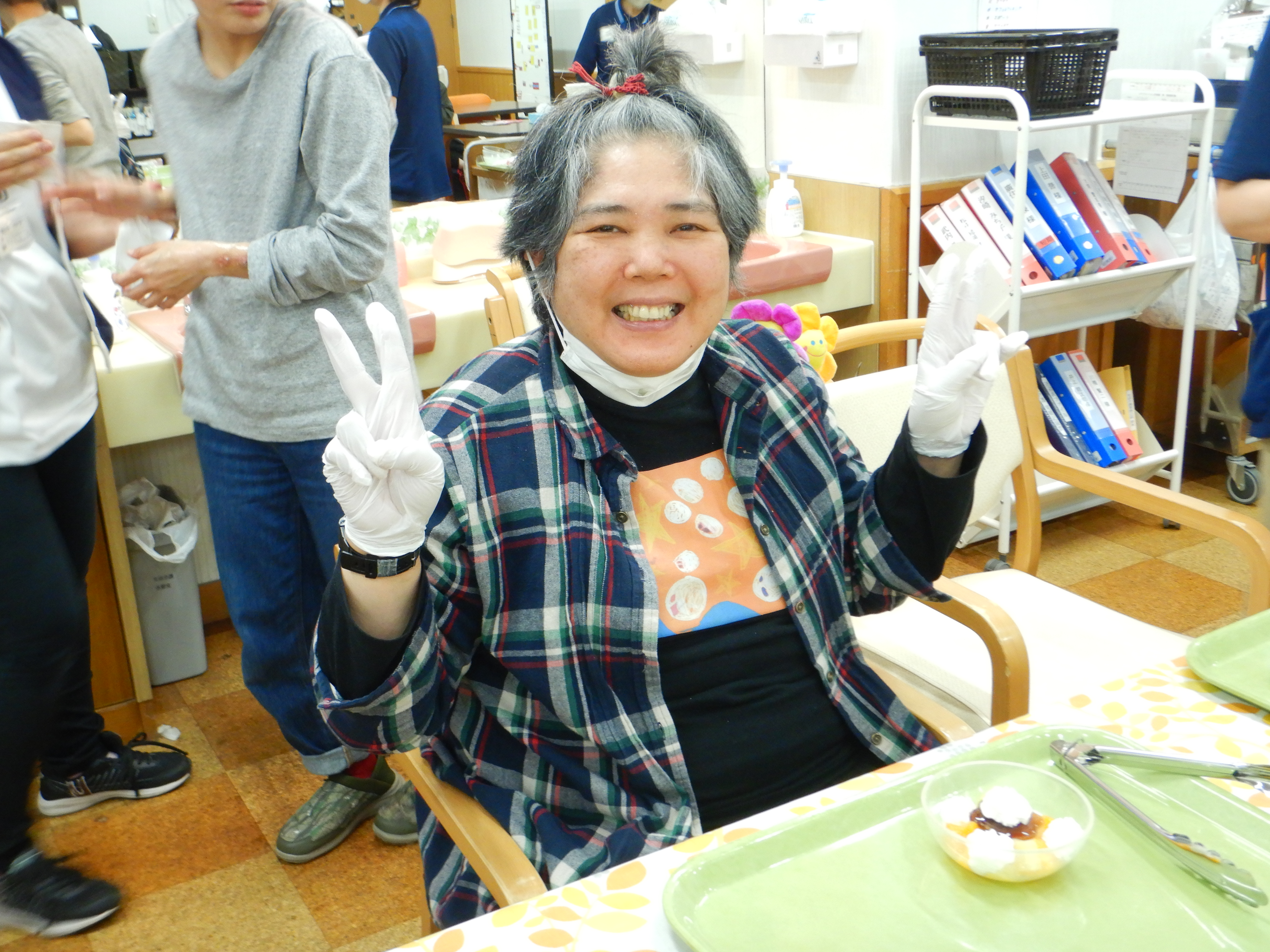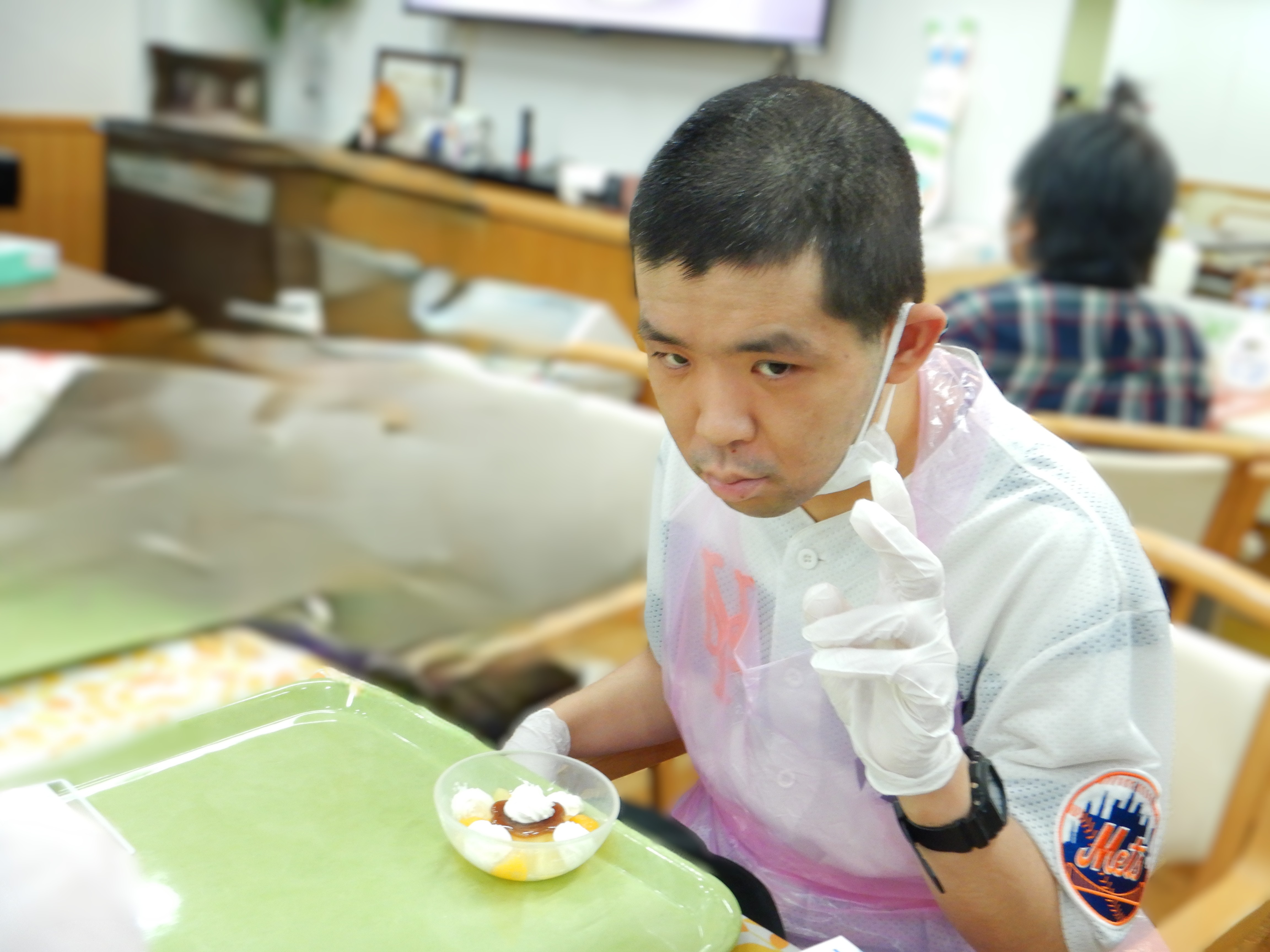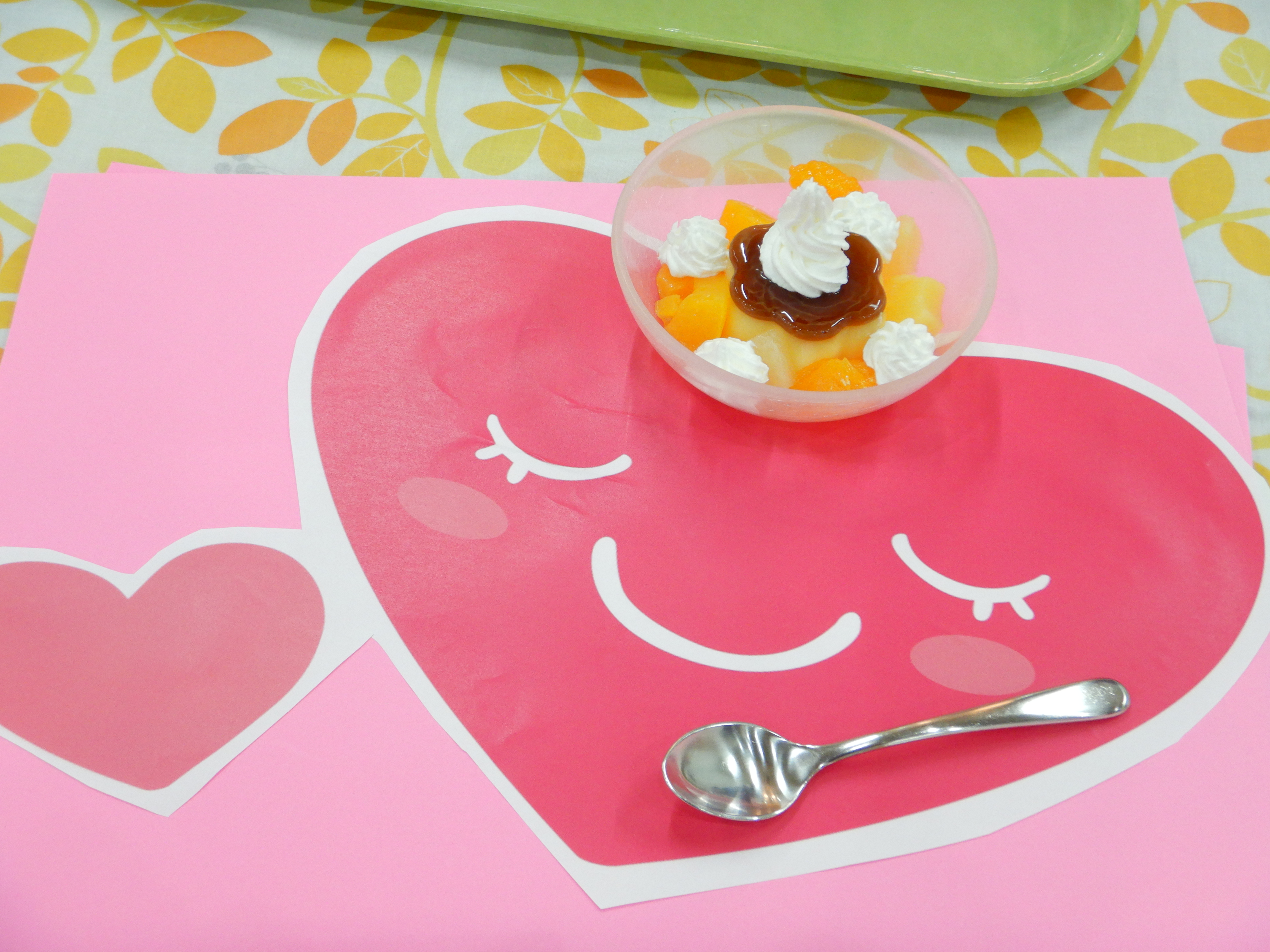 職員もお手伝いしながらみなさんと楽しい時間を一緒に過ごし、世界に一つだけのオリジナルのプリンアラモードの完成です。